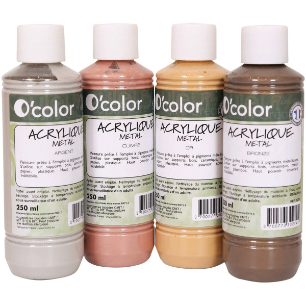 Lot de 4 flacons 250ml de peinture acrylique métal O'COLOR. Or, argent, bronze et cuivre. Peinture à pigments métalliques, prête à l'emploi. Opaque et indélébile. Elle s'applique sur bois, céramique, métal, papier, plastique. Nettoyage à l'eau tiède avant séchage. Contient biocide BIT/MIT qui empêche la prolifération de la moisissure.