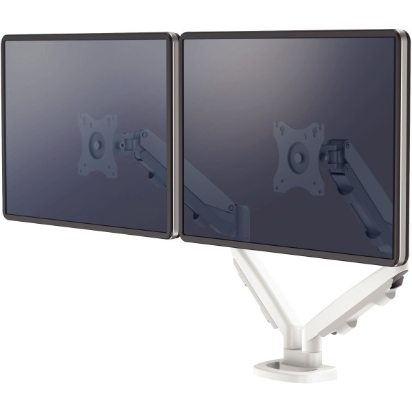 Bras porte-écran double EPPA blanc. Ajustement facile à la simple pression du doigt. Parfait pour le travail collaboratif. Système de passe-câbles inclus pour garder votre bureau ordonné. Chaque bras supporte un écran de 39" et pesant jusqu'à 8 kg max. Répond aux normes de fixation VESA 75x75 / 100x100. Fixation soit par pince soit à travers l'obturateur du bureau. Garantie 5 ans.