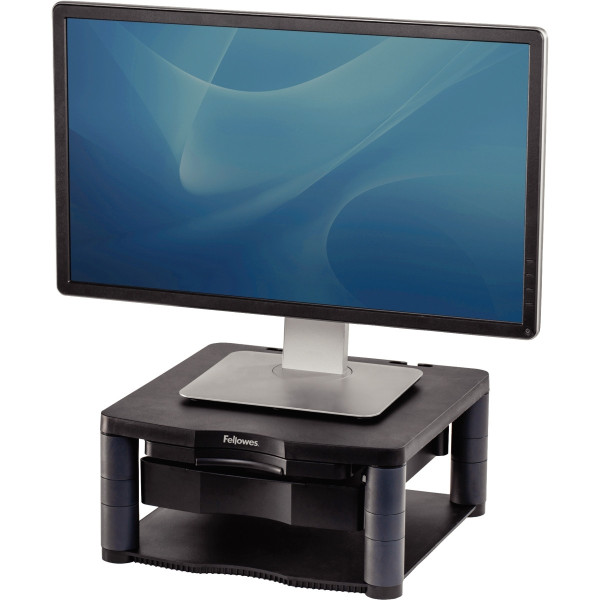 Support écran Premium Plus. Positionne l'écran à un angle de vue confortable. Réglable sur 5 hauteurs. Equipé d'un tiroir de rangement et d'un porte-copies facilement extractible. Supporte jusqu'à 36kg. Système de passe-câbles intégré. Coloris gris foncé. Dim: L33,3xP34cm.