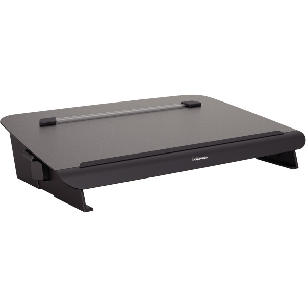 Porte-documents Hana Series noir. Permet de maintenir une bonne posture lorsque vous lisez vos documents afin d'éviter les douleurs cervicales. 5 réglages de la hauteur: de 11,6cm à 21,4cm. La plateforme glisse ver l'avant pour couvrir le clavier, maximisant ainsi l'espace disponible sur le bureau et créant une zone d'écriture ergonomique. Espace pour vos accessoires en dessous de la plateforme. Inclut un guide-ligne magnétique pour maintenir les documents et faciliter la lecture.